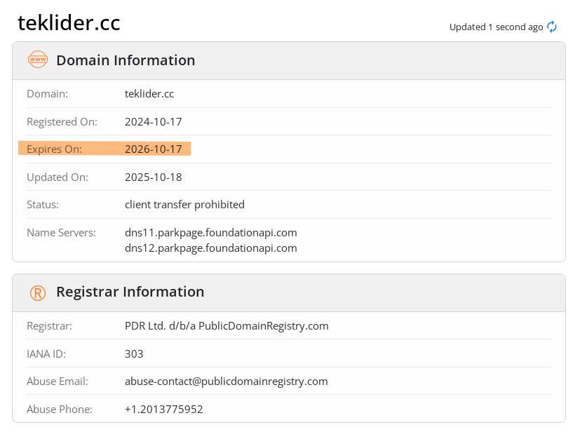 https://teklider[.]cc) in sahipliğini kimliğini bilmediğimiz üçüncü şahıslar tarafından alınmıştır. Bu domainin bizimle bir alakası kalmamıştır. Güncel adresler 'canary' kısmında PGP imzalı şekilde paylaşılıyor ve her hafta haftalık canary mesajıyla birlikte doğrulanıyor. Domaini satın aldığımız sitenin ekran görüntüsü ve Whois ekran görüntüsünden sahipliğinin bizden çıktığını bitiş tarihlerine bakarak da anlayabilirsiniz. Hepinize Rabbimden güzel günler ve iyi dilekler dilerim.