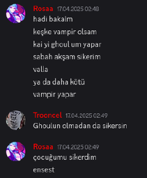 Reddit'teki troonlar doxa karşı bağışıklık kazanmaya başladığı için 'Discord' uygulamasındaki Türk troonları avlamak için r/Turkaaaaa üyesi başka bir troondan bir adet eski Discord hesabı satın aldım. Kendisi alan kişinin 'kötü amaçlı' kullanacağını biliyordu. Siz bu kadarsınız işte iki üç bin TL para için kendi onurunuzu satacak kadar acizsiniz. Discorddaki troonlar, yerli yabancı farketmez sizin için de geliyoruz!